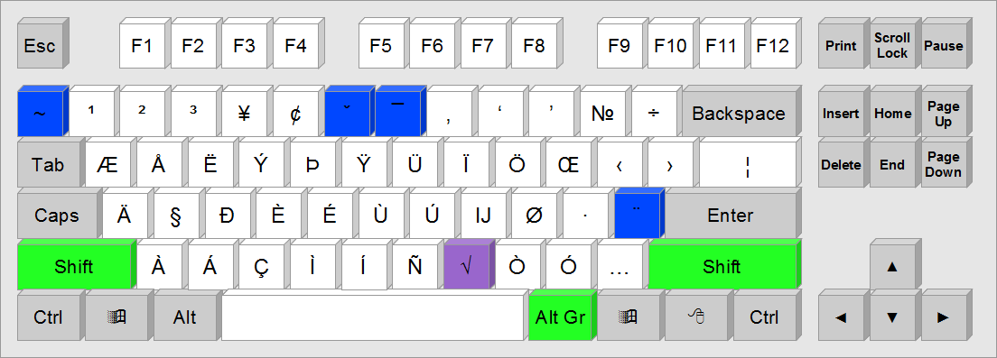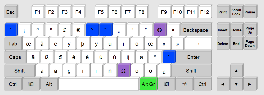 Almost all language specific letters can be generated with Alt Gr. Additional characters can be generated with the composition keys (so called dead keys), highlighted in blue and purple in the picture. In addition, the entire greek alphabet is accessible via the composition key Ω.