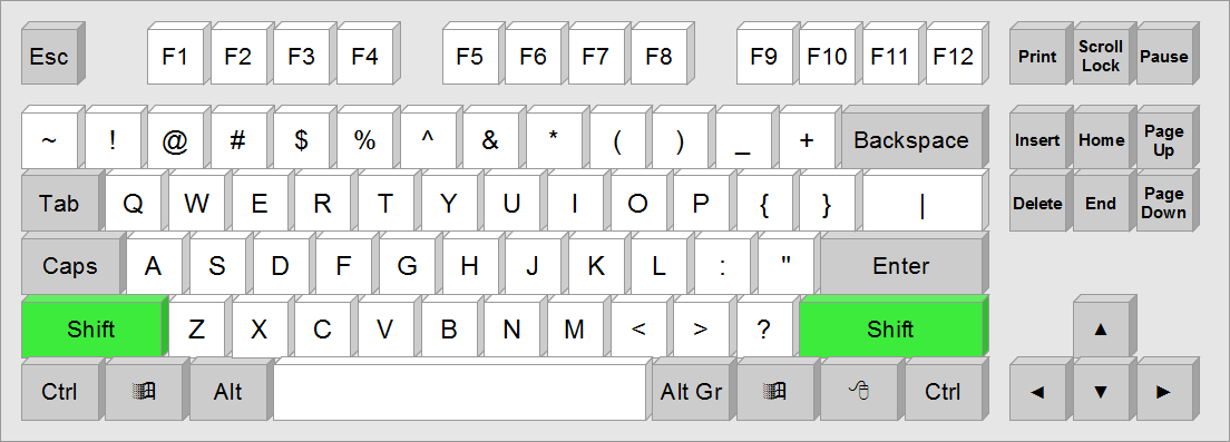 The shifted Alt Gr layout generates the capital counterparts of european characters. The composition key ± provides access to common math symbols. E. g. the infinite sign (∞) can be generated by pressing Shift+Alt Gr+m and i.